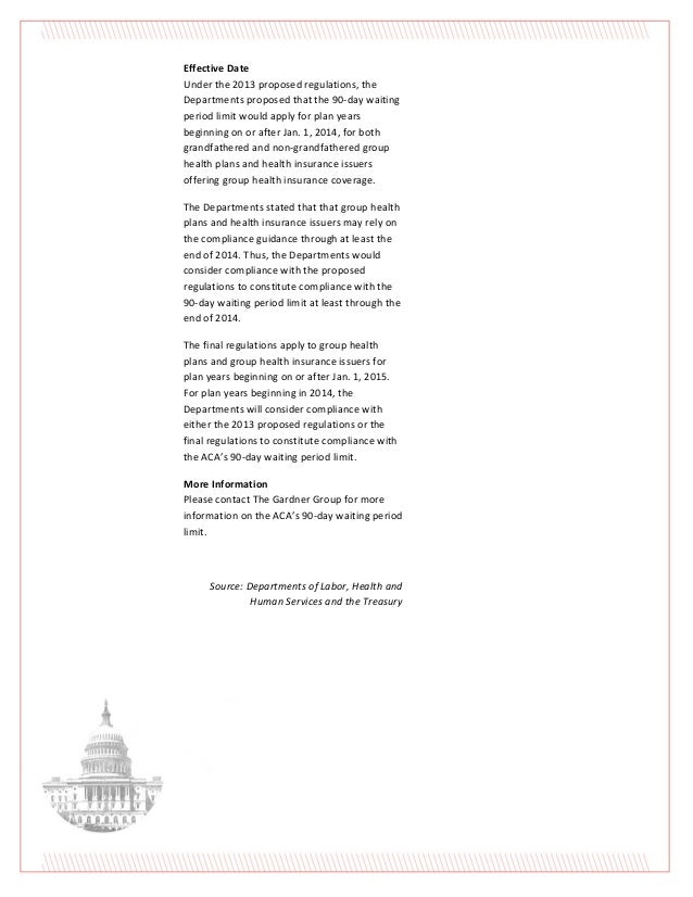 Group health plan or health insurance issuer offering group health insurance coverage shall not apply any waiting period that exceeds 90 days.2 PHS Act section 2704(b)(4), ERISA section 701(b)(4), and Code section 9801(b)(4) define a waiting period to be the period that must pass ... Retrieve Here