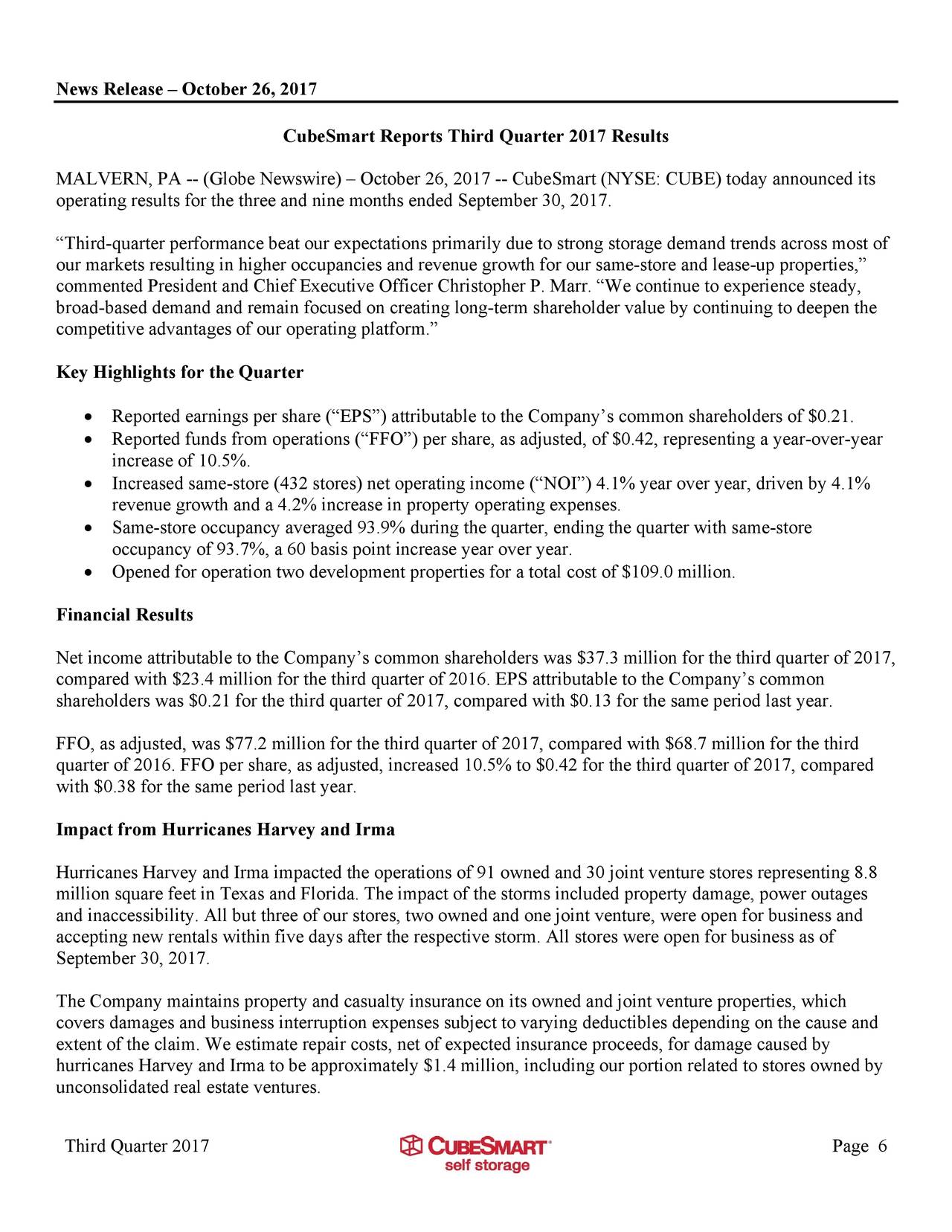 CubeSmart Reports Third Quarter 2017 Results MALVERN, PA -- (Globe Newswire) – October 26, 2017 Opened for operation two development properties for a total cost of $109.0 million. The Company maintains property and casualty insurance on its owned and joint venture ... Fetch This Document